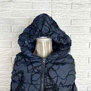 Calvin Klein Performance Puffy Blue Vest Black Velvet Squiggles Water Repellent Interior MP3 Player Pocket Hide-able Hood Size Medium