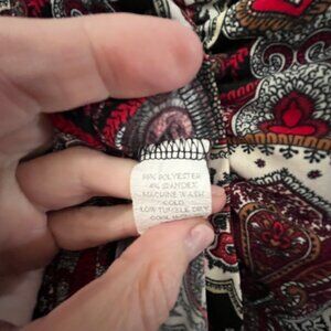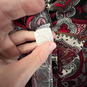 The pattern is a paisley style in black, white, and many shades of red. Overall effect is more dark maroon/blacks than red.
