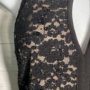 Beautiful NW Night Way Black Stretch Lace Halter Cocktail Dress. Features subtle black Sequins, scalloped hem, fully lined, keyhole front and tie neck with Back zipper. Women Sz 4. Armpit to armpit 16”, waist 12” across (stretches) shoulder to hem 35”.