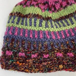Vibrant knit beanie with a mix of colors. Features green, purple, and pink tones. Made in Nepal.
