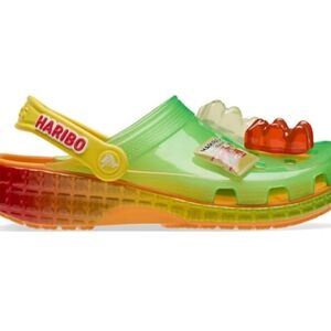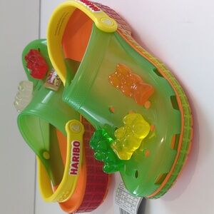 These vibrant sandals feature a playful gradient color scheme transitioning from bright yellow to light green, complemented by an orange-to-yellow gradient sole. Made from a durable plastic or rubber-like material, they boast a unique clog-like design with a closed toe and open heel. The standout feature is the candy-shaped decorations, including gummy bear-like shapes in red, yellow, and green, adding a whimsical touch.