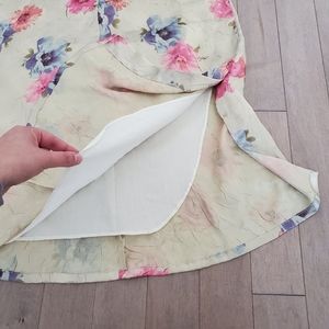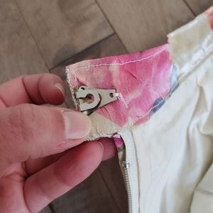 This piece is stunning!!! Gold maxi length high waisted skirt with pink and blue flowers. It is hand made and there are no tags.