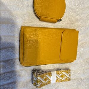 This vibrant yellow clutch is a stylish accessory, featuring a detachable wristlet and a convenient coin pouch. Its bold color and sleek design make it a standout piece for any occasion.