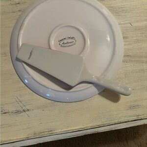 Cake plate is 11 inches across and server is 10 inches long. Very good condition.