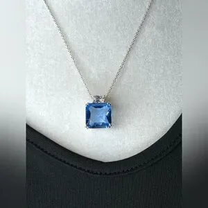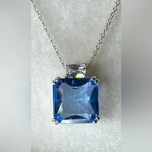 This elegant necklace features a stunning blue pendant, perfect for adding a touch of sophistication to any outfit. The delicate chain complements the vibrant blue stone beautifully. The necklace is approximately 18" long and the blue pendant is 1" x 1" and framed in sterling silver.