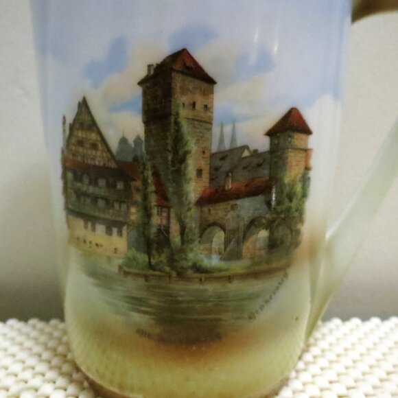 Antique Pitcher Three Crown China Germany 5.75" Signed is a stunning piece of porcelain decor originating from Thuringia, Germany. This vintage pitcher, manufactured by Unger & Schilde, features a captivating scene depicting Hangman's Bridge and Water Tower in Nuremberg. With a capacity of 3 cups, this glossy, multicolored pitcher stands at 5 3/4 inches tall and is a true collector's item. Imported to the USA by Jon H. Roth & Co., this unique piece is a must-have for anyone who appreciates famous buildings and historical craftsmanship.