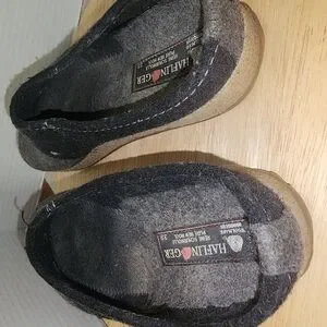 Experience the comfort of Haflinger's felt mules, featuring a stylish gray and black color-blocked design. These slip-on shoes boast a unique scalloped edge and simple decorative patterns, making them both cozy and chic. Perfect for indoor wear, they offer a snug fit and durable construction.