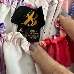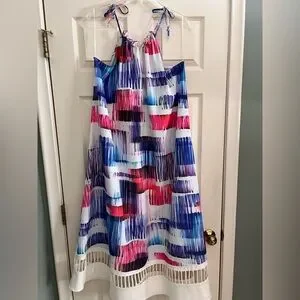Beautiful Sun Dress in Hues of red, white and blue. Has shoulder ties ( not adjustable ) and cute cutout bottom hem. Perfect rayon blend fabric weight and does not easily wrinkle.
