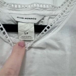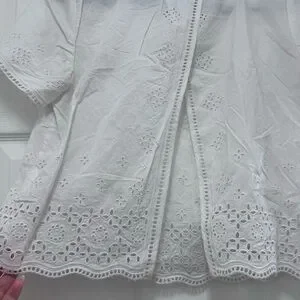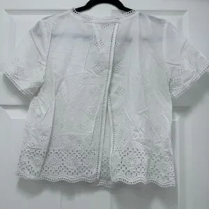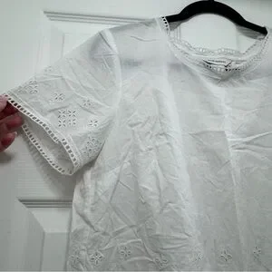 Round neck; short sleeves; crossover open back; scalloped hem; allover embroidered eyelet detail