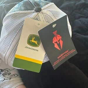 Stylish John Deere trucker hat. Features blue and gray pattern. White mesh back for breathability. Perfect for casual wear.