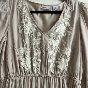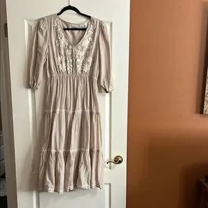 Stylish beige dress with beautiful detail by Lucky Brand. Worn in Tuscany and Texas Hill Country Wineries. Looks fab with a large brim hat and oversized sunglasses.