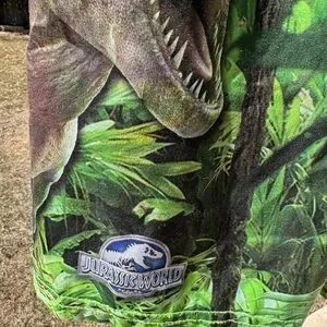 Vibrant green swim trunks featuring Jurassic World dinosaurs. Perfect for beach or pool.