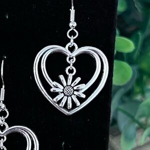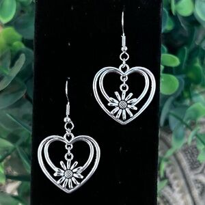 New, Silver heart earrings feature a delicate dangling floral design, perfect for adding a touch of sophistication to any outfit.