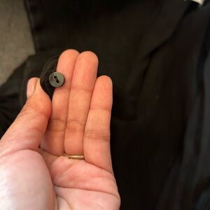 It’s V neck and pleated design. True to size. The string belt is missing. But you can use any belt or just go with out. No holes or stains. Never worn.