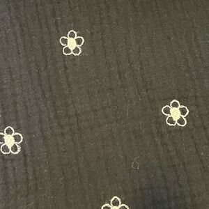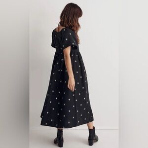 Square neck midi dress is a gauzy mid-weight cotton. Embroidered daisies on front and back.
