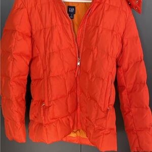 Bright orange puffer jacket by GAP. Features a zip closure and side pockets.