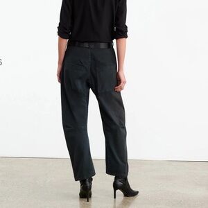 The Nili Shon pant is a mid rise barrel leg stretch cotton twill pant. Seam detaill at knees. Gusset at inseam. Zip fly.