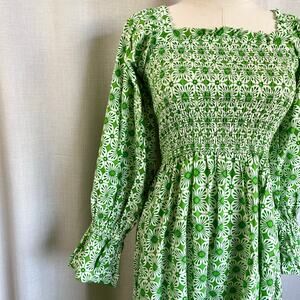 Elizabeth Wilson 100% Cotton Green White Smocked Ruched Floral Maxi Dress Small