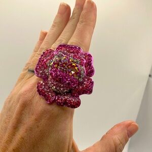 This exquisite ring set showcases a vibrant pink floral design paired with a bold orange accent, creating a captivating and colorful statement piece. The intricate detailing and sparkling stones add a touch of elegance, making it perfect for any occasion.