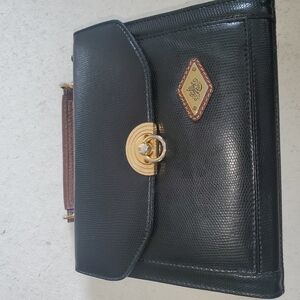 These vintage vibe leather purses feature a sleek black Saint Rosa flap bag and reddish maroon clutch highlighted by striking gold accents.