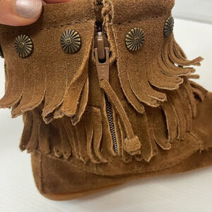 Minnetonka Double Fringe Side Zip Boot Dusty Brown Size 9