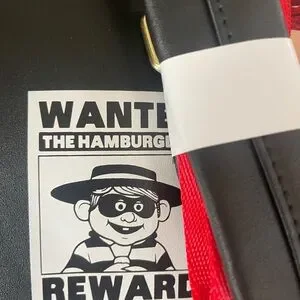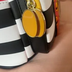 Loungefly backpack featuring a McDonald's character design. Black and white stripes with red and yellow accents. Brand new with tags