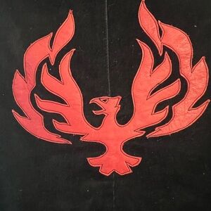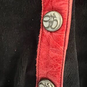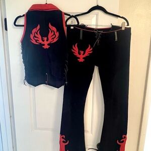 Electric Barbarella vintage corduroy pants with matching vest thunderbird and cross leather design with leather flames at bottom. One off design lace up front and back low rise pants sit on hips worn on a motorcycle tv show from 90’-2000’s