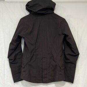 Nau brand Eco Circle tech all weather jacket, detachable hood, inside pocket for phone, sleeves to roll up or leave down. Excellent used condition, there are no flaws. Beautiful women's recycled material coat. Multiple pockets with both zip and snap, wind blocking zip and button closure. Sustainable deep eggplant brown all-weather fabric. Outdoor adventure commute packable light layer!