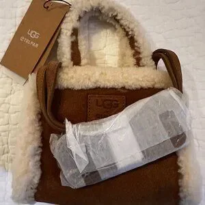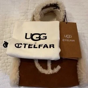 "Our iconic Unisex TELFAR Bag made in collaboration with UGG in genuine chestnut suede with a cuddly shearling trim. Bag features double strap to worn cross-body, inlaid shearling TELFAR logo, 100% cotton lining and magnetic snap closure.