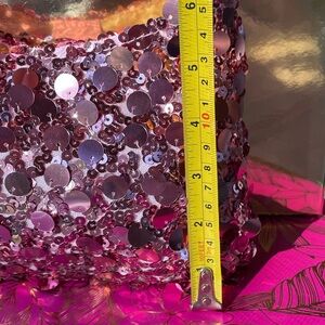 Add sparkle to your outfit with this stunning pink sequin handbag. Perfect for a night out or special occasion. Pretty in Pink Accessory!