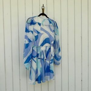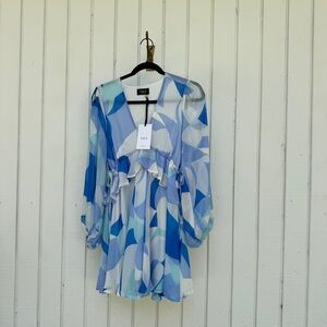 Stylish VICI dress with a blue and white pattern. Features long sleeves and a flowy design.