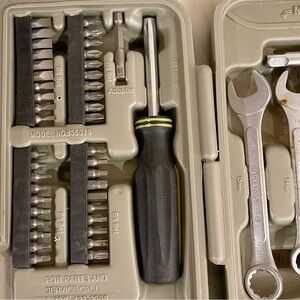 Trades Pro brand 127pc Mechanics Tool set. Includes ratchet set, wrenches, screwdrivers, Allen keys, pliers, interchangeable bit set Great Preowned Condition with Some Scuffing and Cracks to Outside Casing and One Side of Casing Closure Lock Has Started to Break, Set Is Missing One Wrench as Shown in Photos