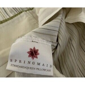 This bundle includes four Springmaid pillowcases, all size standard/queen and made of 100% cotton. Two of the pillowcases feature an off-white color with green and white polka dot fabric trim, while the other two pairs coordinate with the same color green on the trim and stripes of green, beige, blue, and brown on an off-white background.