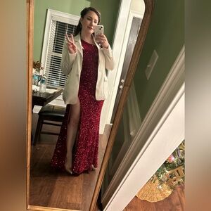 Worn once two years ago to a ball. Velvet/soft texture with the sequins makes it not itchy under the arms. The slit is kind of high.