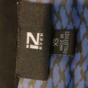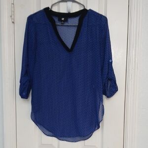 This Iz Byer blouse showcases a relaxed fit in a rich blue hue, featuring a V-neckline with black trim and 3/4 sleeves that can be rolled up. The lightweight, slightly sheer fabric adds an elegant touch, making it perfect for both casual and formal occasions.