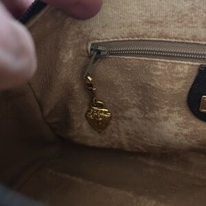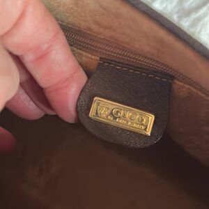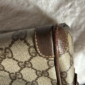 Gucci Vintage 1989 Monogrammed GG canvas and leather crossbody bag. Preowned with some interior peeling wear which is dry. Small rubbing on corner piping which looks to have been painted. No wear on canvas. Straps have some creases and tiny cracks and fading but no major wear. Inside has one zipper pocket with beautiful zipper pull. All zippers work good. Great brown and tan wirh GG logos. Super unique design of Gucci to add to your collection.