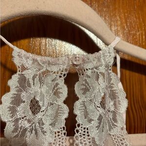 VICTORIA’S SECRET baby pink lace chemise sleep dress. Material is 84% viscose and 16% silk. Some signs of wear in the lace trim that is pictured. Adjustable straps and a button close at the back on the top of the neck. Size XS and ready for a new home!