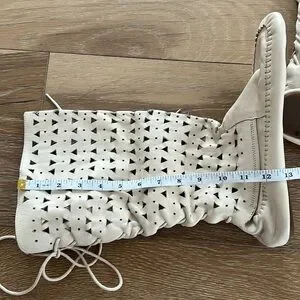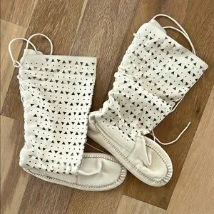 Vintage cream leather knee-high moccasin style boots with perforated design and lace-up back. Never worn.