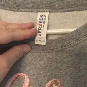 This Jerzees sweater in a classic crew neck style features a lively and colorful graphic design on the front, set against a soft gray backdrop. The long sleeves and comfortable fit make it a perfect choice for casual outings or cozy days at home. The playful print adds a touch of whimsy and charm to your wardrobe.