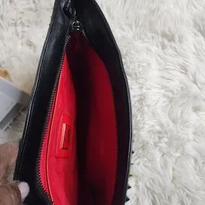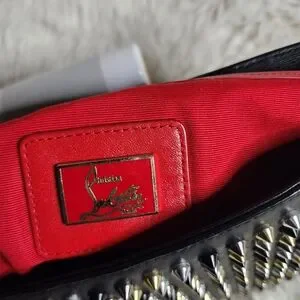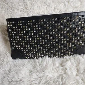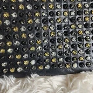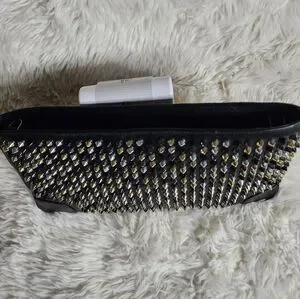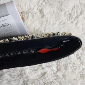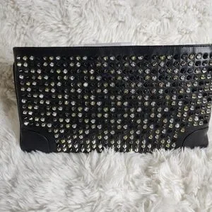 Elevate your style with this Christin Louboutin Loubiposh studded clutch. Featuring a striking black and gold design, it's perfect for any occasion.