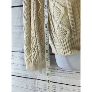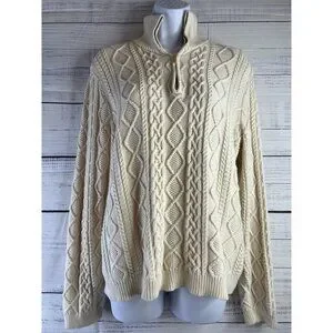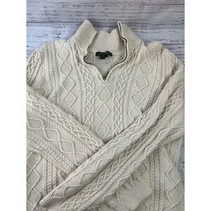 This Ralph Lauren sweater is a stylish choice for women in size XL. It features a classic ivory color with a cable knit design and a 3/4 zip closure. The sweater has a mock neck neckline and long sleeves, making it suitable for various occasions such as travel, beach outings, weddings, parties, casual wear, or work. The preppy academia style is perfect for a polished and timeless look, while the 100% cotton fabric ensures comfort and quality.
