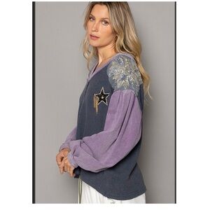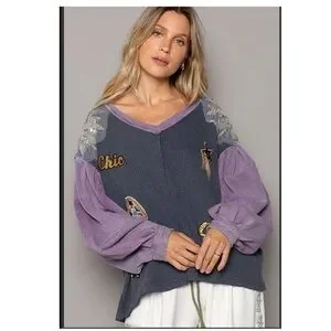 Stylish POL sweater with unique embroidered patches. Features a mix of blue and purple colors.