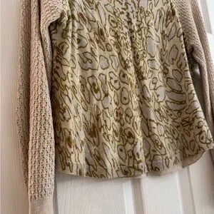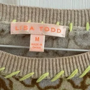 This Lisa Todd blouse features a captivating graphic design in earthy green and cream tones. The ribbed sleeves and sides add a touch of texture, complementing the intricate patterns on the main body. Perfect for adding a unique flair to your wardrobe.