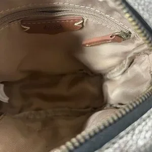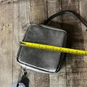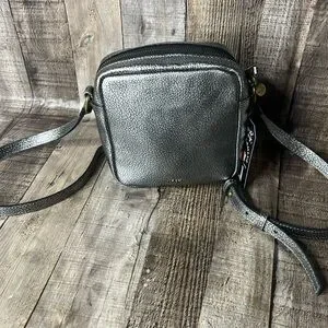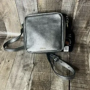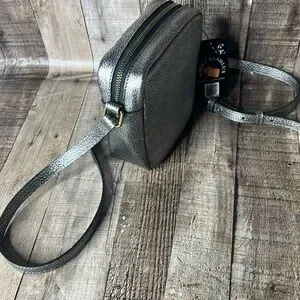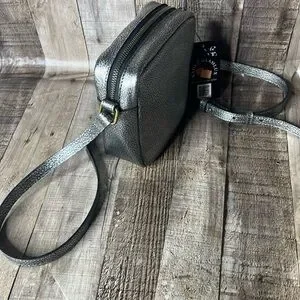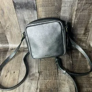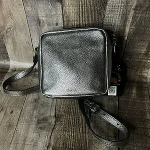 This gray messenger bag from The Sak features a sleek, pebbled leather design, perfect for casual or semi-formal occasions. Its minimalist style and adjustable strap make it a versatile choice for carrying essentials in a compact, stylish manner. This bag is in excellent condition.