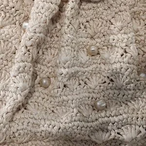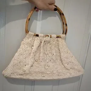 Gorgeous vintage "It's in the Bag" handbag from the 60s or quite possibly the 50s. She's a beauty, intricately crocheted raffia, pearl beads, bamboo handles & in near pristine condition! Perfect for your tiki looks, vacation or resort wear, or any warm weather fun you've got planned, this little conversation piece is a lovely neutral that will match everything!