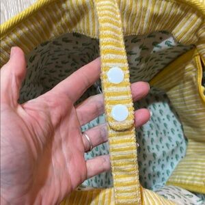 Lacoste yellow terry beach/tote bag with pouch. Bag is in good condition. Flaws are in the last few photos… One corner is slightly flawed, some darker marks on back yellow bands, and the clasp that attaches the pouch to the bag is broken. I did see that another seller posted just the small pouch that appears intact ;)