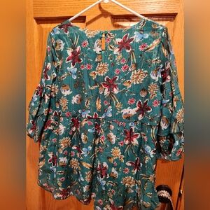 Chic floral blouse in emerald green with vibrant patterns. Super cute sleeve detail. Perfect for any occasion.