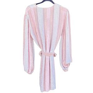 Retrofete Gabrielle Robe Dress in Pastel Pink Stripes. Size S / Small. Features detachable waist tie with velvet, shell disc accent sequins allover, lined, mini length. 100% viscose. Style SS20-2701. NWT / New with tags.