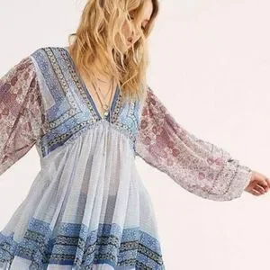 NWT, Free People, Blue Aliyah Printed Tunic, Long Sleeve, Sheer