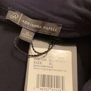 This elegant blouse by Adrianna Papell features a sophisticated tie front and a distinctive sailor collar, all in a classic bark blue and white color scheme. The buttoned design adds a touch of refinement, making it a versatile addition to any wardrobe. Perfect for both professional and casual settings, this blouse offers a timeless style with its chic detailing.Pit to pit 23 inches. Length 26.5 inches. Machine washable.